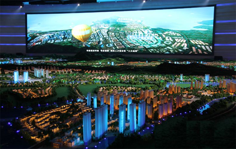 首先將城市的所有(建筑、交通、環(huán)境)制作成三維動畫內(nèi)容;其次用制作好的沙盤模型展示城市的風(fēng)貌,然后利用投影機(jī)將三維動畫內(nèi)容投射到屏幕上,大屏幕在播放的同時,實(shí)體沙盤模型也會同步配合展示,呈現(xiàn)出震撼的視覺效果。
