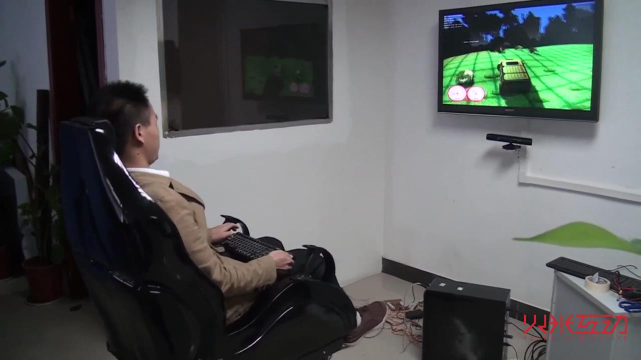 視頻中展示的是4D影院中的動感座椅,根據游戲的故事情節,由計算機控制做出特技效果,可以帶來震動、顛簸等特效。從而調動了認得感知系統,使參與者仿佛真的參加了這個游戲,非常驚險刺激,帶來身臨其境的體驗感。